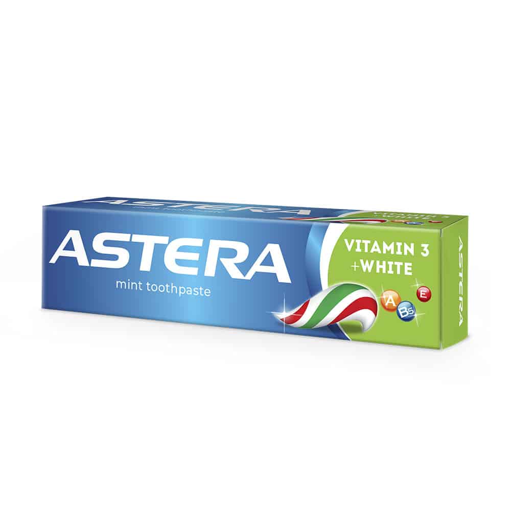 Astera Vitamin 3+ White 110 г е паста за зъби, която съчетава силата на витамините A, C и E с избелваща формула за сияйна усмивка. Витамините подхранват венците и укрепват зъбите, докато специалните избелващи агенти премахват петна и възвръщат естествената белота на емайла. Осигурява цялостна защита срещу кариеси и плака, както и дълготраен свеж дъх.