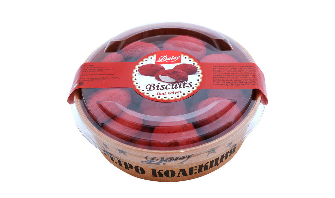 Потопете се в луксозния вкус на Бисквити "Дейзи" Червено кадифе (Red Velvet). Тези бисквити са неустоима комбинация от мек, червен, какаов блат и нежен, кремообразен пълнеж. С тяхната уникална визия и богат вкус, те са идеалният избор за специален десерт или за сладка пауза с кафе.