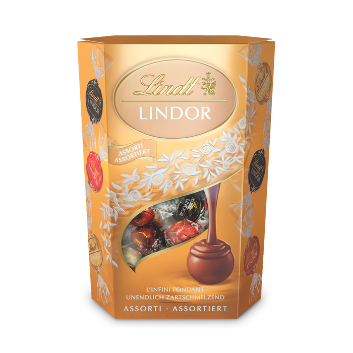 Насладете се на неустоимото и разнообразно удоволствие на Lindor с този луксозен асортимент от бонбони. Всяка кутия съдържа комбинация от най-популярните вкусове Lindor (като млечен, черен, бял шоколад, лешник или други), обгърнати в перфектна кръгла шоколадова обвивка, която крие топящ се в устата, кремообразен център. Този асортимент е идеалният подарък или луксозно удоволствие за споделяне.