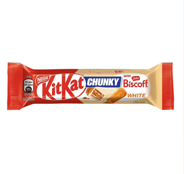 Насладете се на най-новия, неустоим десерт – Kit Kat Chunky White Biskoff! Тази вафла е изключителна комбинация от класическата хрупкава пръчица, покрита с нежен бял шоколад, и плътен пълнеж с карамелизирания вкус на Бискоф (Biscoff). Перфектното сладко удоволствие, което съчетава познатото с екзотичното.