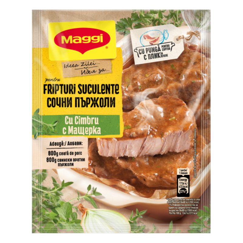 Пригответе невероятно сочни и ароматни пържоли с изтънчен вкус на мащерка без усилие с микс Maggi от 28 г. Този микс от подправки е идеално балансиран, за да придаде на месото ви наситен, средиземноморски аромат и да го запази крехко и сочно по време на печене или пържене. С него си гарантирате гурме резултат, който ще впечатли цялото семейство.