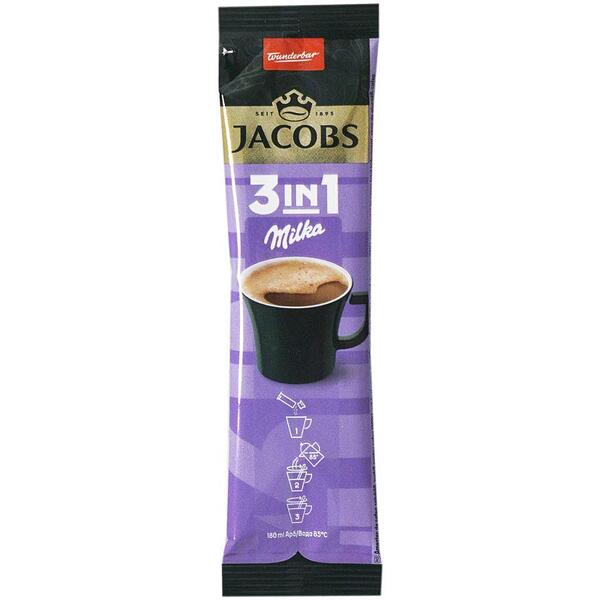 Jacobs Milka 3в1 разтворимо кафе съчетава нежния вкус на Jacobs кафе, млечна пяна и фин млечен шоколад Milka. Перфектната комбинация от кафе, мляко, захар и шоколад го превръща в апетитна и бърза напитка, готова само с добавяне на гореща вода. Идеално за всички, които обичат по-сладки и кремообразни кафета.