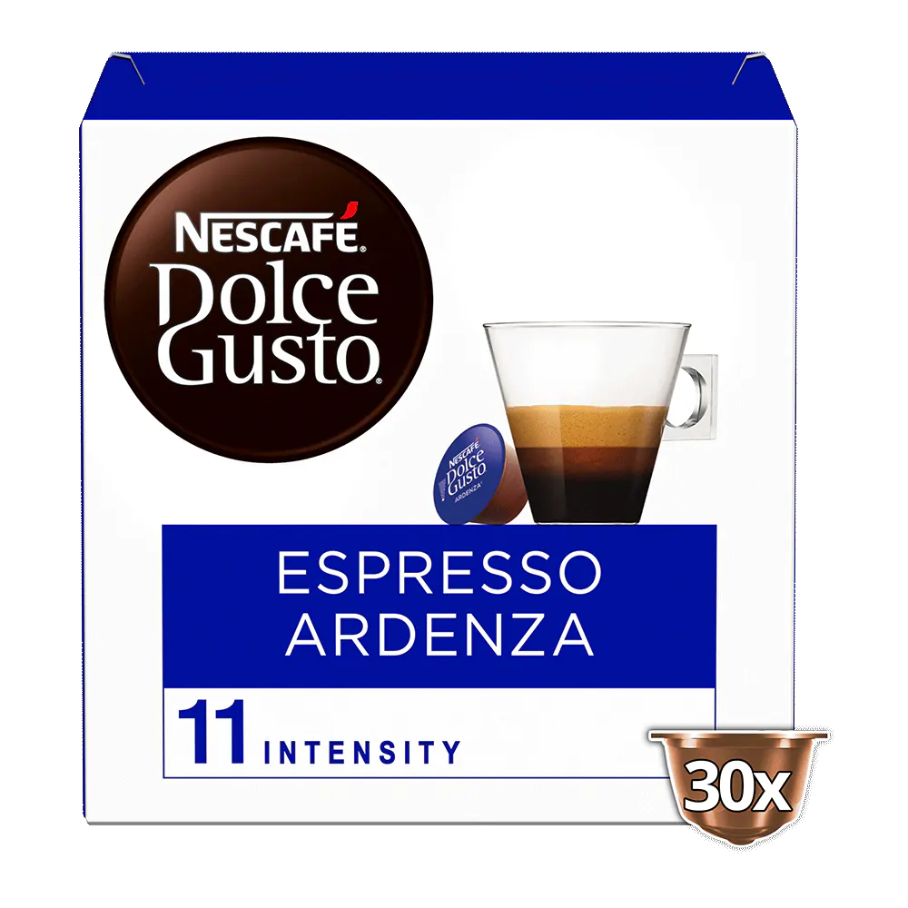 Открийте максималната интензивност с капсулите Nescafe Dolce Gusto Espresso Ardenza. Този бленд е създаден за любителите на силното, тъмно изпечено кафе, като предлага наситен, плътен вкус с нотки на печени ядки и черен шоколад. Опаковката съдържа 30 капсули, които осигуряват 30 порции мощно еспресо.