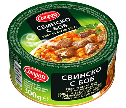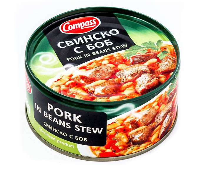 Насладете се на традиционния вкус на свинско с боб от "Компас". Тази консерва е перфектното решение за бърз и вкусен обяд или вечеря, когато нямате време да готвите. Ястието е приготвено по класическа рецепта, с внимателно подбрани парчета свинско месо и боб, което гарантира автентичен и домашен вкус.