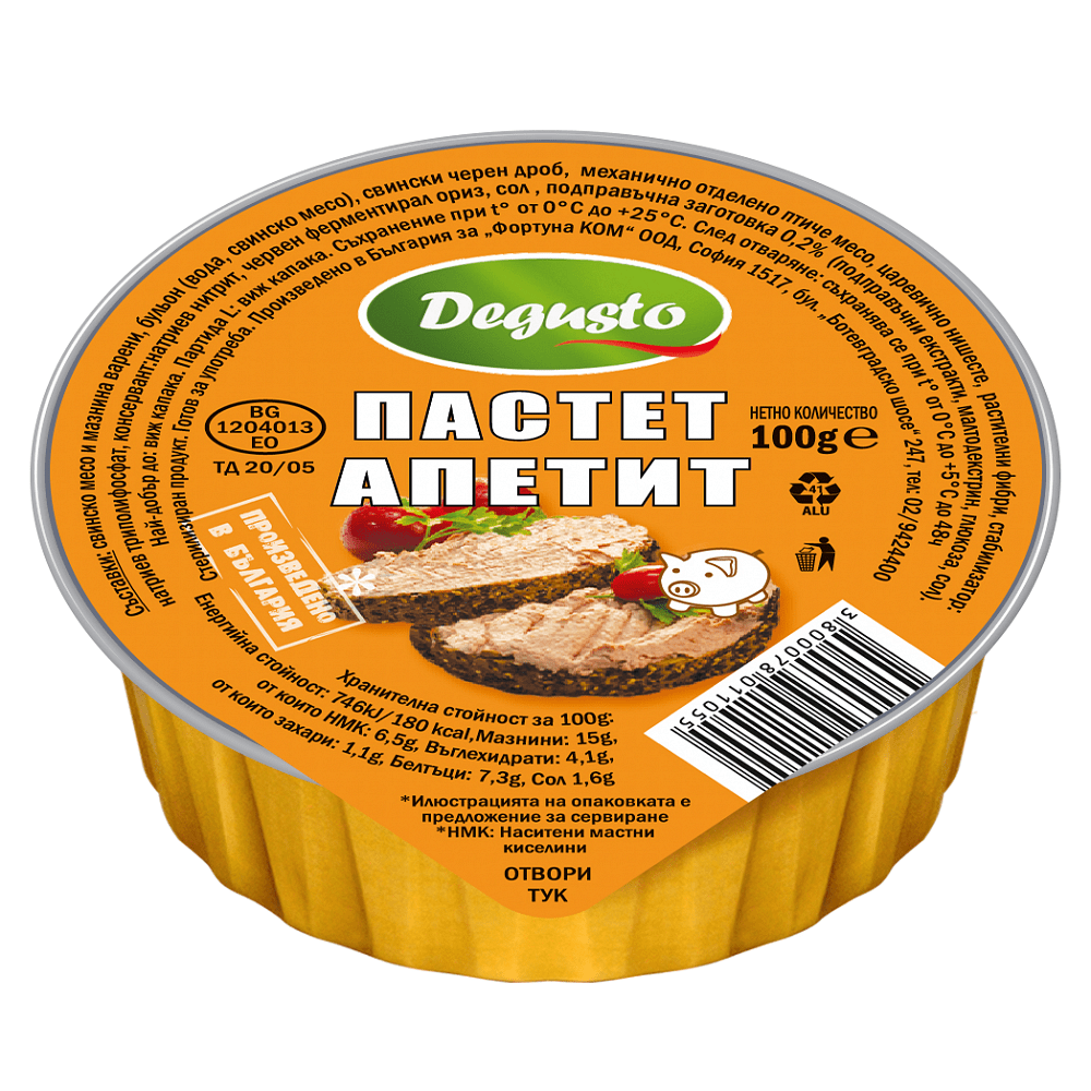 Насладете се на класическия и наситен вкус на пастет „Дегусто“ Апетит. Със своята фина и гладка текстура, той е идеално допълнение към вашите сандвичи и закуски. Пастетът е приготвен с грижа и подбрани съставки, за да осигури вкусно и питателно изживяване, което ще задоволи всеки апетит.