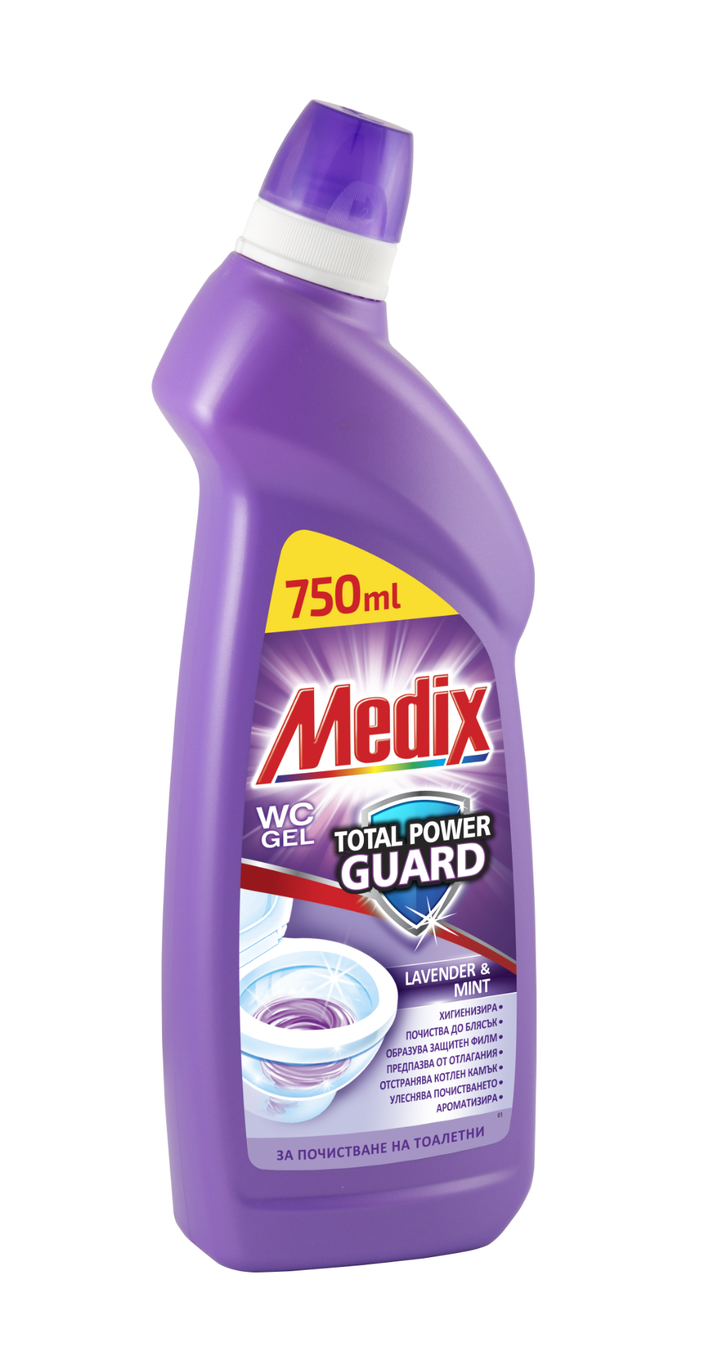 Препаратът за почистване на тоалетна Medix WC Gel Lavender & Mint осигурява мощно и хигиенично почистване на вашата тоалетна чиния. Неговата гъста гел формула полепва по стените на тоалетната, за да разтвори и премахне варовик, упорити петна и мръсотия, като оставя повърхността искрящо чиста и блестяща. Продуктът ефикасно унищожава бактериите и осигурява дълготрайна свежест с успокояващ аромат на лавандула и мента.
