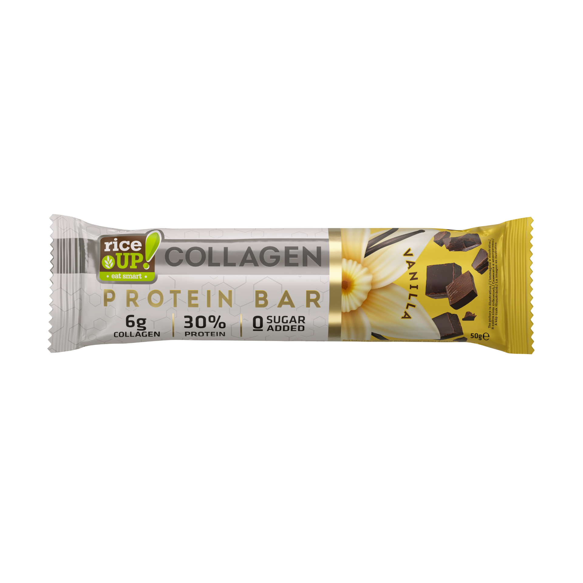 Заредете се със здравословен протеин и грижа за красотата с колагеновия бар RiceUP! с вкус на ванилия. Този бар е създаден за тези, които търсят питателен снакс с високо съдържание на протеин, като същевременно е обогатен с колаген за подкрепа на здравето на кожата, косата и ставите. Без глутен и с неустоим ванилов вкус.