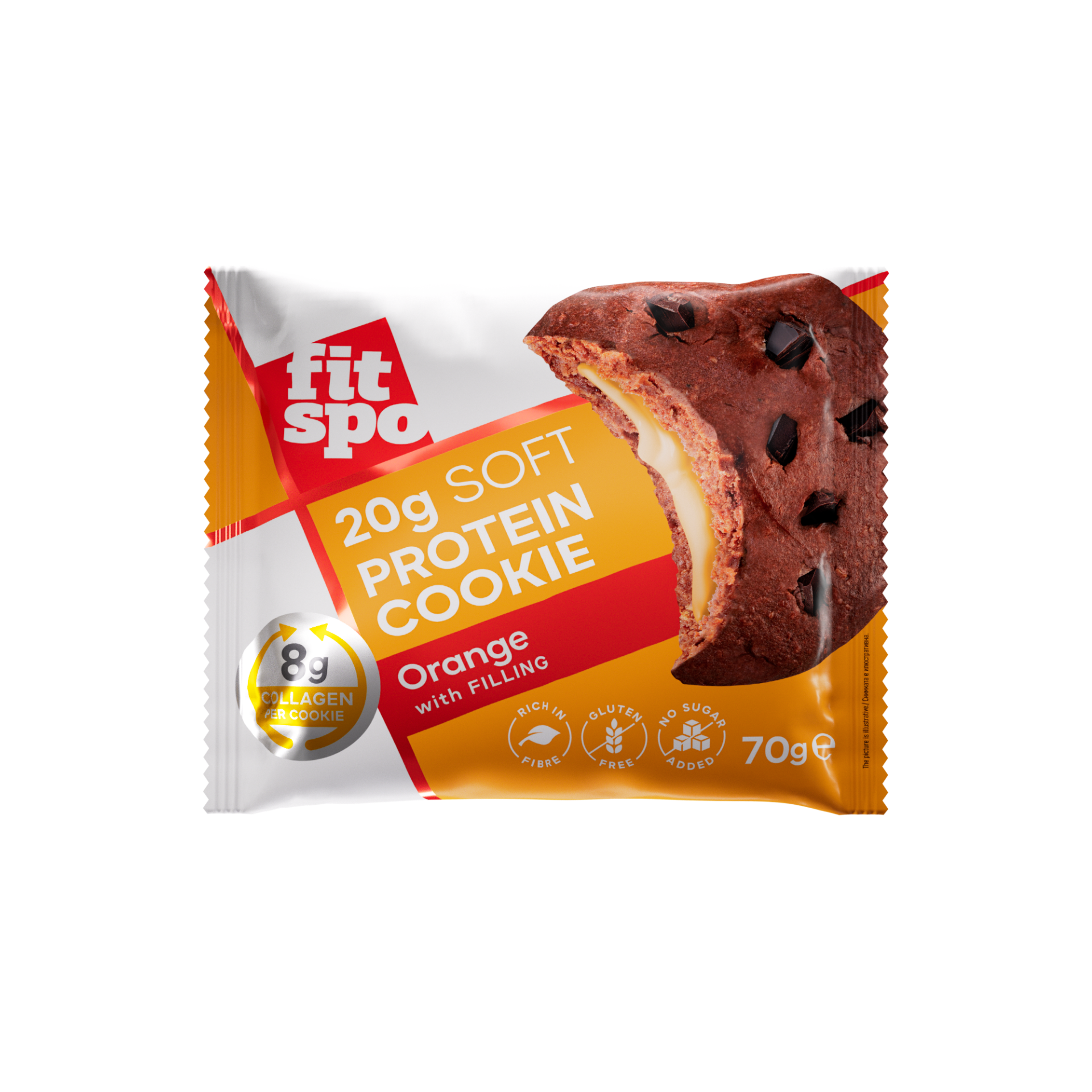 Насладете се на голямото и засищащо удоволствие на Протеинова бисквита FitSpo с ободряващ цитрусов вкус на портокал. Тази бисквита от 70 грама е идеалният заместител на хранене или плътен междинен снакс, като съчетава приятна текстура с високо съдържание на протеин. Тя е създадена за хора, които се нуждаят от енергия и протеини, но не искат да правят компромис с вкуса.