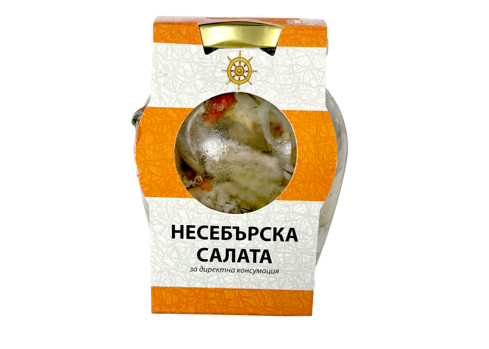Насладете се на автентичния вкус на Черноморието със Салата по Несебърски от "Морски риболов". Тази готова рибна салата е приготвена по традиционна рецепта, като съчетава рибни продукти (често филе от херинга/скумрия) с мариновани зеленчуци и богат дресинг. Салатата е идеална за сервиране като студено предястие, мезе или като част от празнична трапеза.