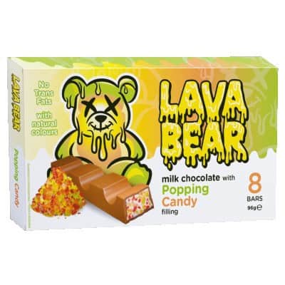 Потопете се в неустоимата комбинация от вкусове и забавно усещане с шоколад Lava Bear с гърмящи бонбонки (пукащ карамел). Този шоколад съчетава нежен млечен шоколад с хрупкави, пукащи бонбони, които създават ефектна експлозия в устата. Идеален за тези, които търсят десертно изкушение с добавен елемент на забавление.