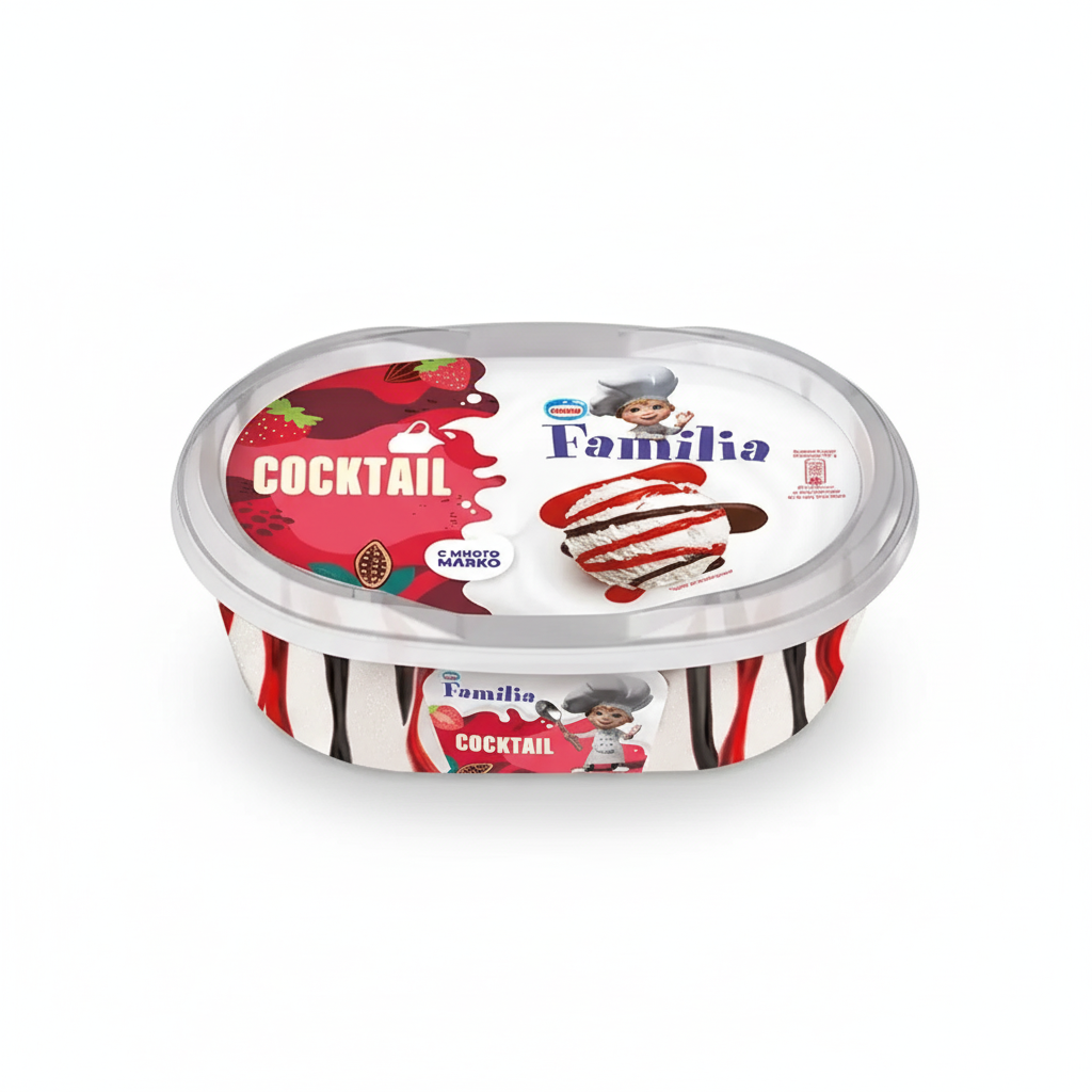 Насладете се на цветно и освежаващо удоволствие със сладолед FAMILLIA Коктейл. Този сладолед е перфектната комбинация от различни плодови вкусове, които създават апетитен "коктейл" от свежест. Голямата опаковка от 345 грама е идеална за споделяне със семейството или за да се насладите на богата порция от любимия си десерт.