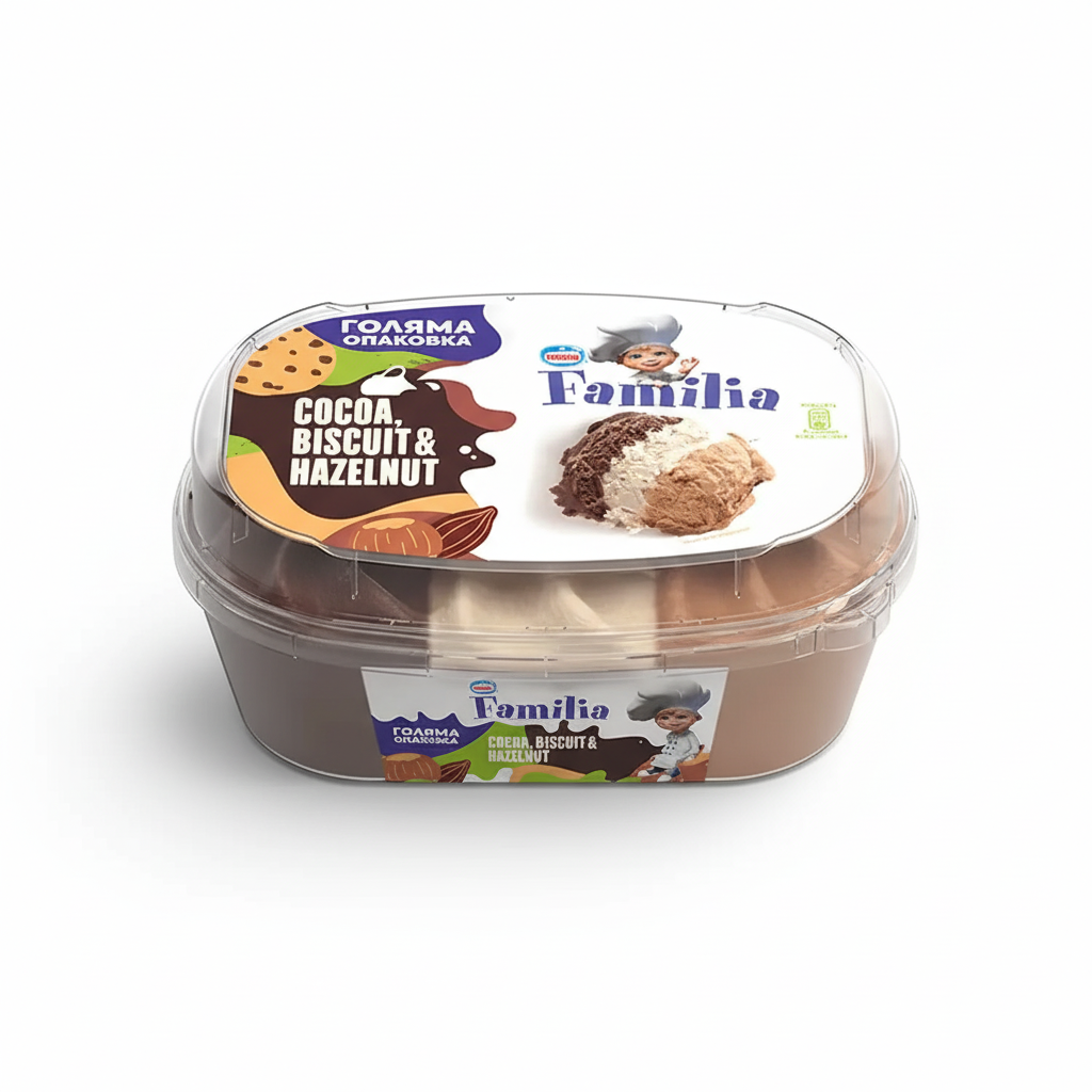 Насладете се на комбинация от любими вкусове в една голяма опаковка! Сладолед FAMILLIA с лешник, бисквита и какао (често част от серия "3 в 1") е перфектният избор за тези, които търсят богат, ядков и шоколадов десерт. Кремообразната текстура, съчетана с хрупкави бисквитени и ядкови парченца, прави този сладолед неустоим. Голямата опаковка от 433 грама е идеална за споделяне със семейството.