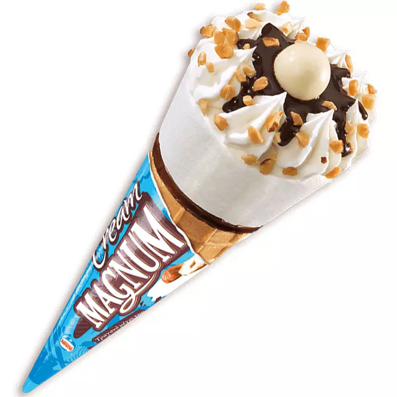 Насладете се на луксозното, хрупкаво удоволствие със сладолед Magnum в класическа форма на конус. Този десерт е перфектната комбинация от кремообразен Magnum сладолед, често с ванилова или шоколадова сърцевина, плътен шоколадов сос и хрупкава шоколадова глазура. Конусът е идеален за бърз, засищащ и елегантен десерт в движение.