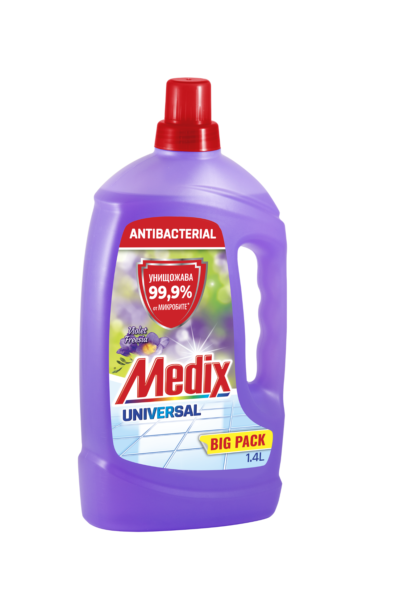 Универсалният почистващ препарат Medix UNIVERSAL ANTIBACTERIAL Violet & Freesia е вашият надежден съюзник в борбата срещу мръсотията и бактериите. Неговата антибактериална формула осигурява не само безупречна чистота, но и хигиенична среда, като елиминира до 99.9% от бактериите. Продуктът ефективно премахва мазнини, прах и упорити замърсявания, като оставя след себе си дълготраен и освежаващ аромат на виолетка и фрезия.